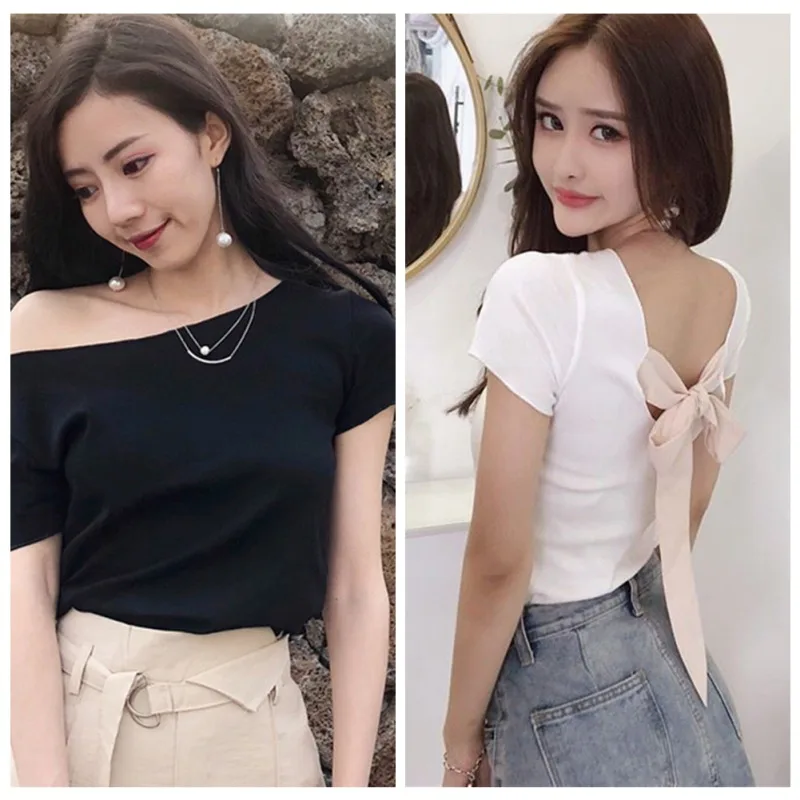 Images of Hot Sale Girls T-Shirt Backless big Bow Women Vintage O Neck Short Sleeve Solid Top :