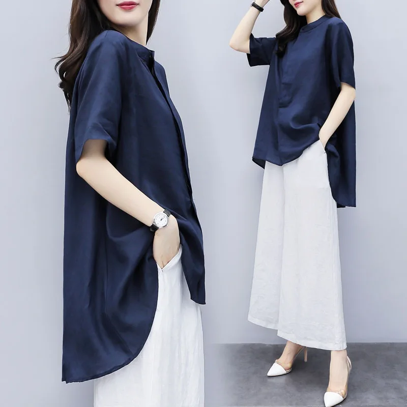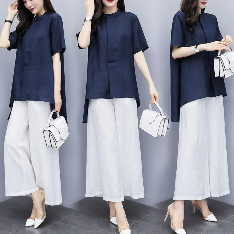 New New women's summer wear large two-piece Pants Cotton hemp short sleeve top wide leg pants casual fashion suit for women