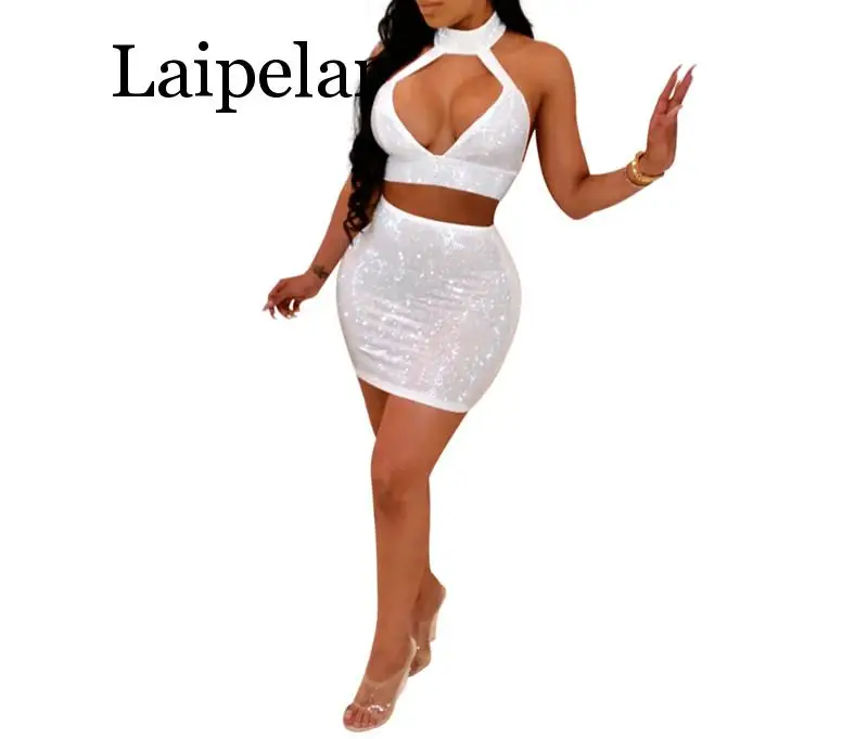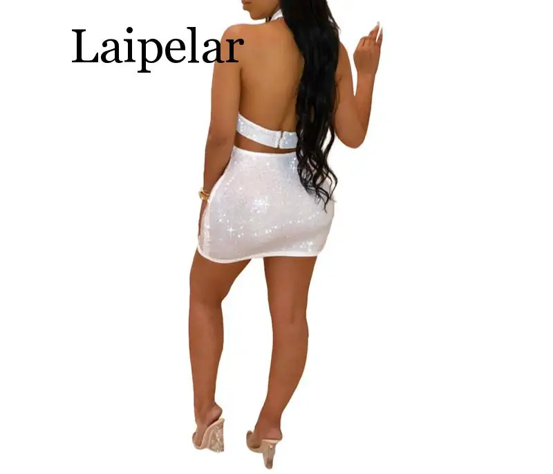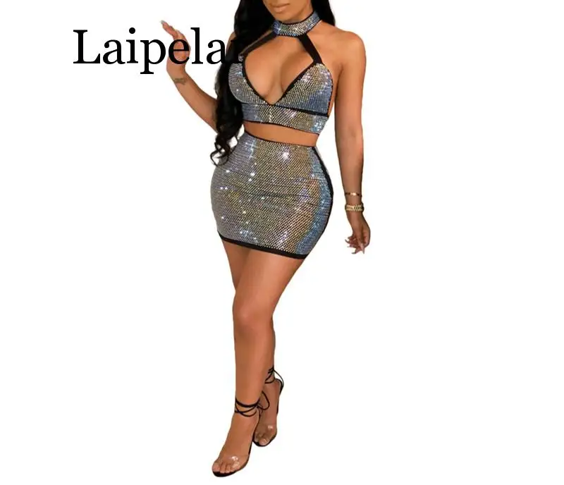 Images of Laipelar 2020 Women Diamonds Two Piece Set Dress Deep V Neck Sleeveless Open Back Halter Crop Top Mini Skirt Club Outfits :
