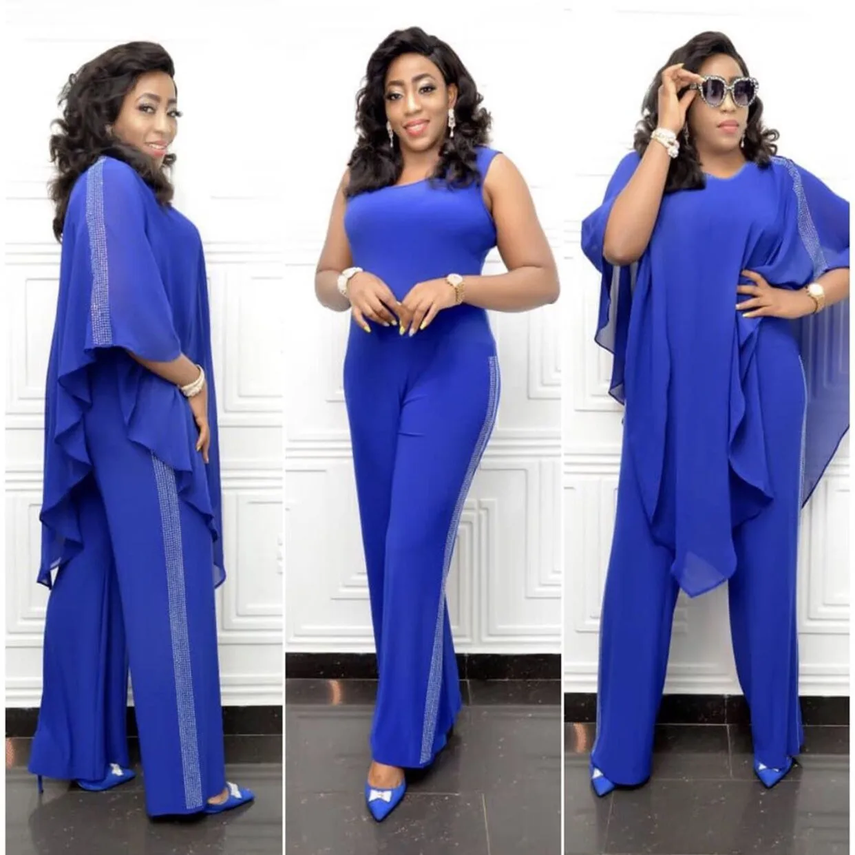 New Women Plus Size Jumpsuit 2 Piece Set Female Summer Solid Blue Black Elegant Chiffon Cape with Sequin Matching Two piece Outfits