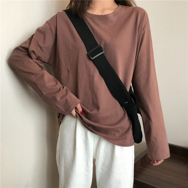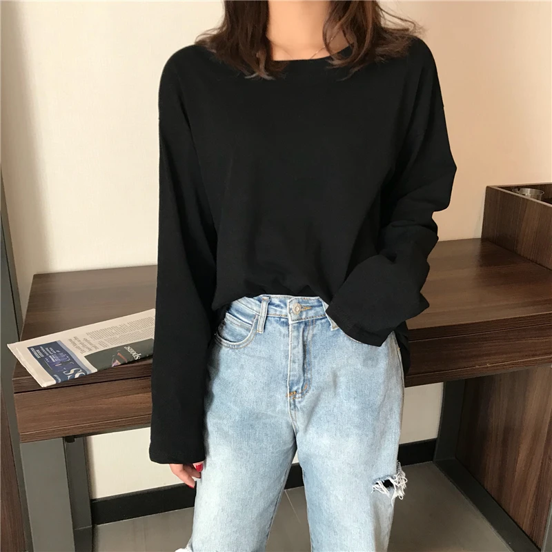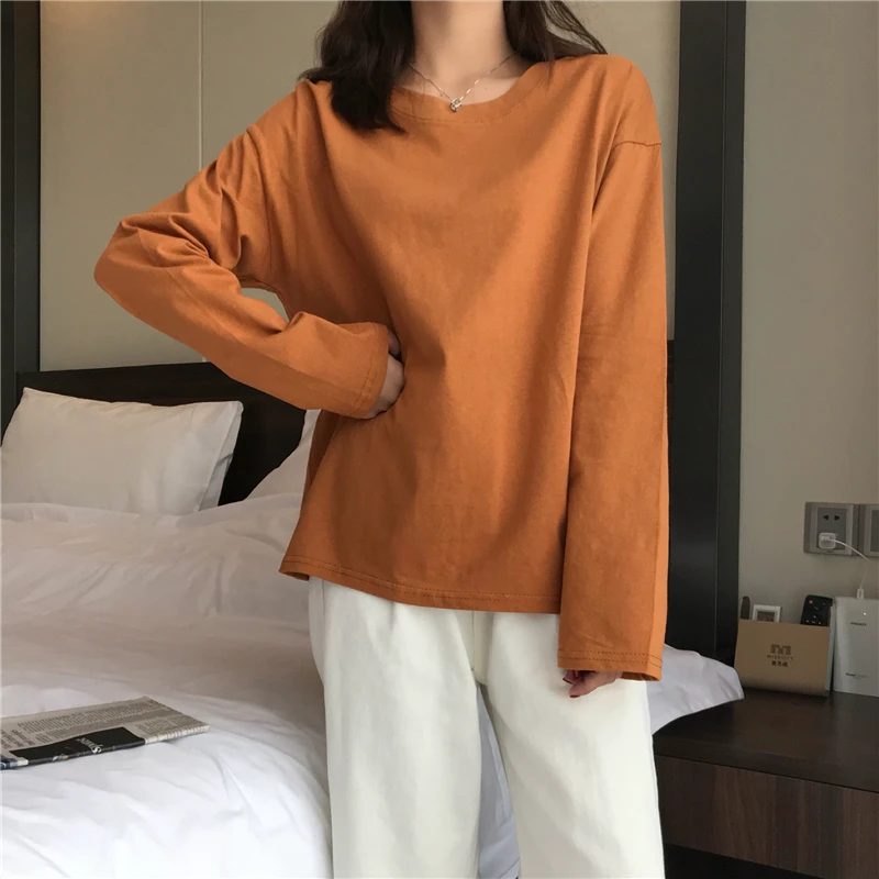 Images of Cotton Tshirt Women Long Sleeve Casual Solid O-neck White T Shirt Girl Top Female Black Green Blue Pink Tunic 2020 Spring New :