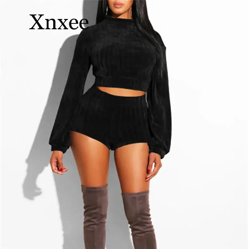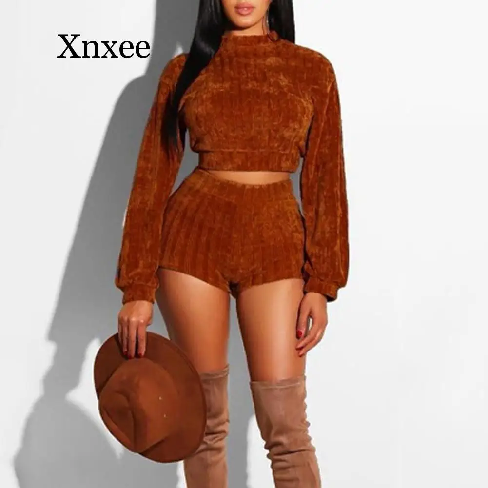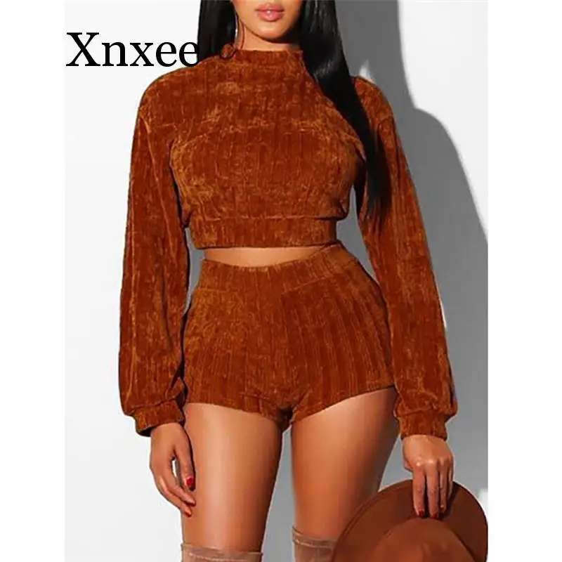 New Women 2 Piece Outfits Sets Long Sleeve Print Crop Tops Shorts Set Casual Lady Warm Fashion Party Clothes