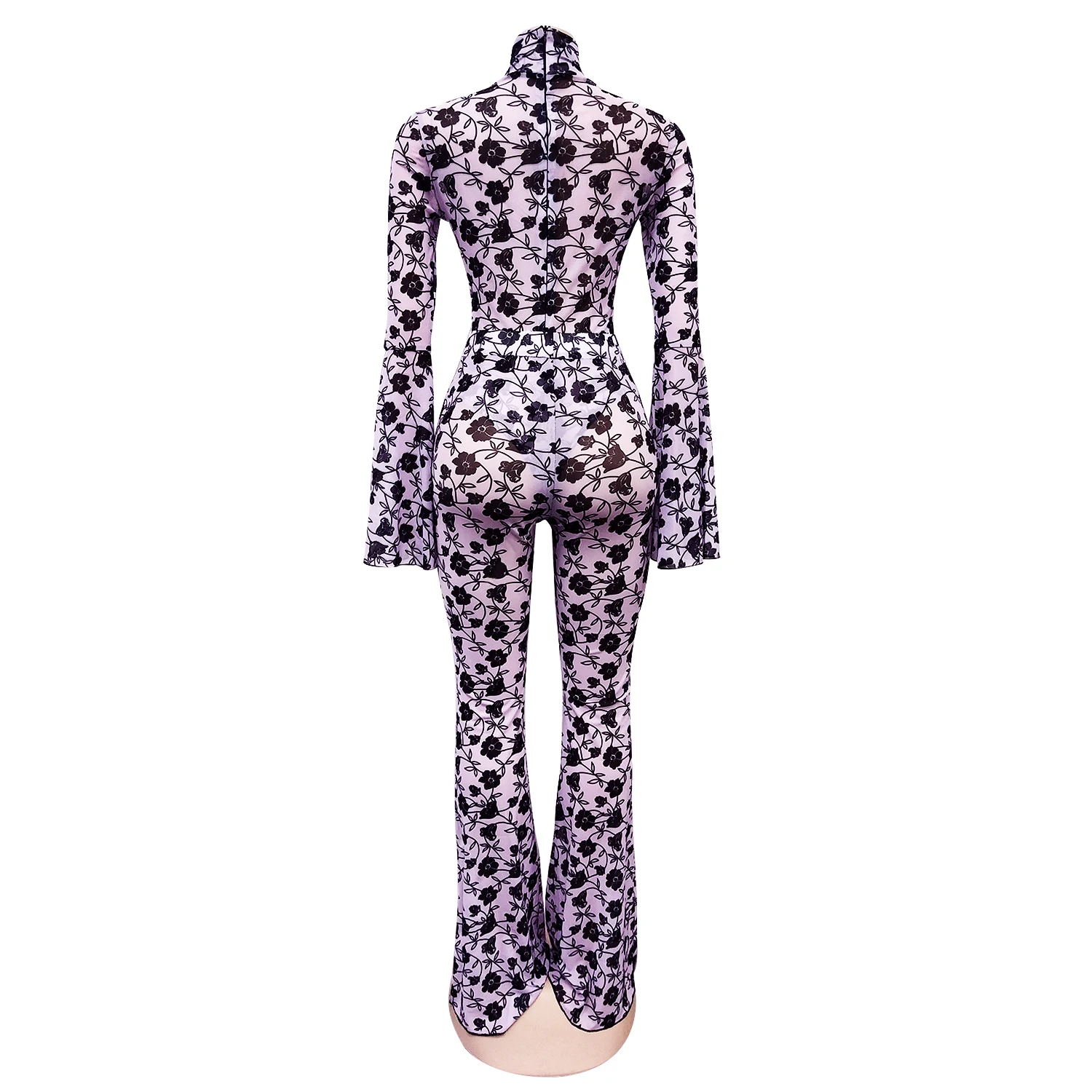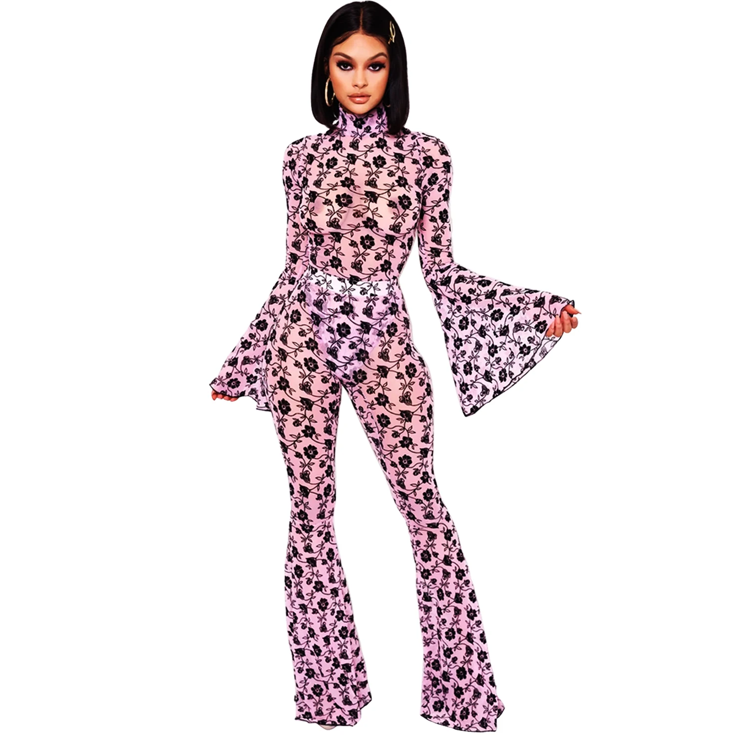Images of New Mesh Floral Spliced 2 Piece Matching Set Women Turtleneck Flare Sleeve Bodysuit And Bell Bottom Pant See Through Outfit :