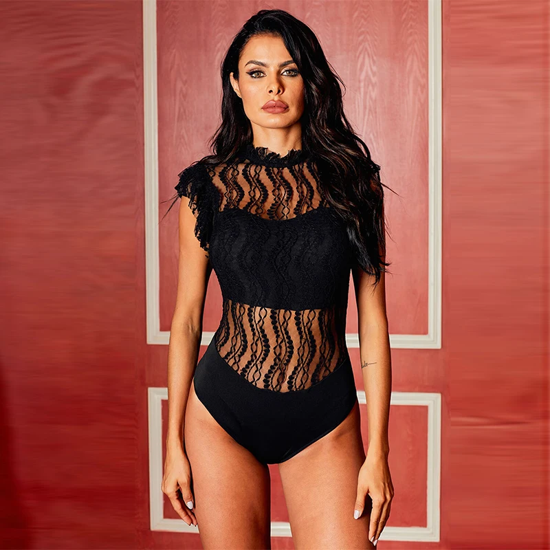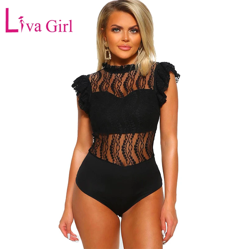 Promo LIVA GIRL Women Floral Lace Bodysuit Sexy Woman Sheer Black Turtleneck Sleeveless Bodysuits Female Bodycon Jumpsuits Club Tops