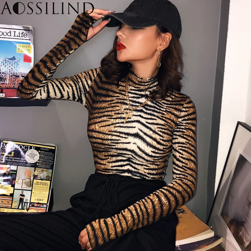 Images of AOSSILIND Autumn Tiger Print Turtleneck Long Sleeve Bodysuit Women 2019 Winter Leopard Bodycon Club Bodysuits :