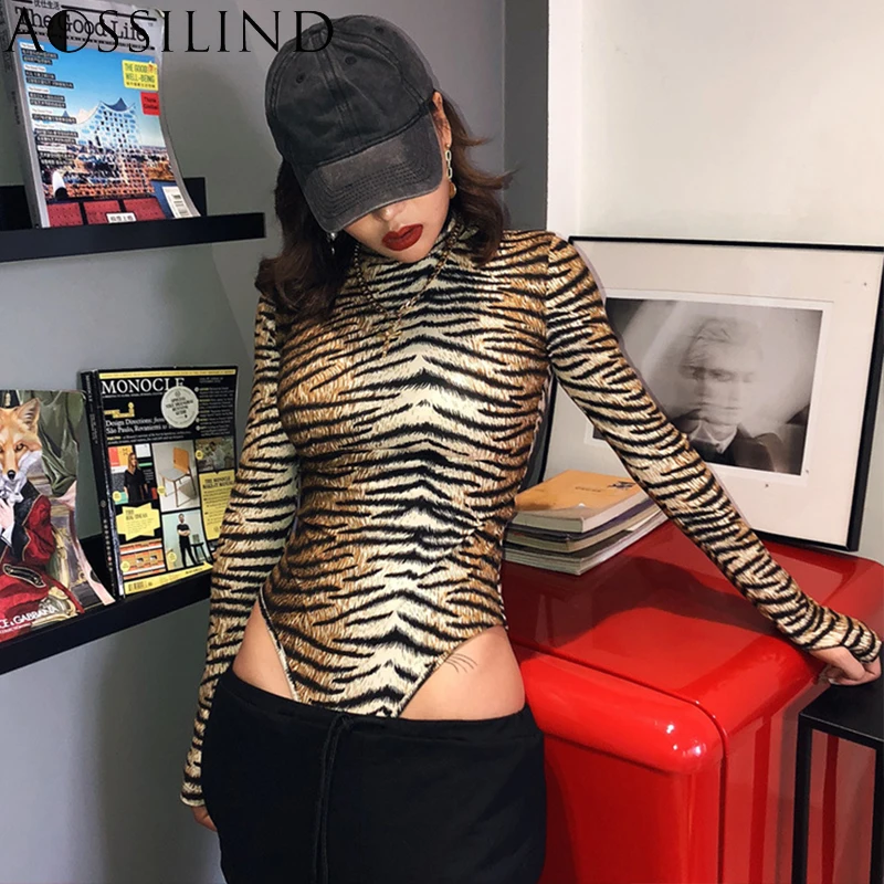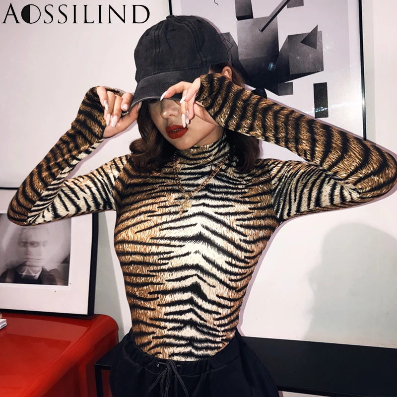 Promo AOSSILIND Autumn Tiger Print Turtleneck Long Sleeve Bodysuit Women 2019 Winter Leopard Bodycon Club Bodysuits