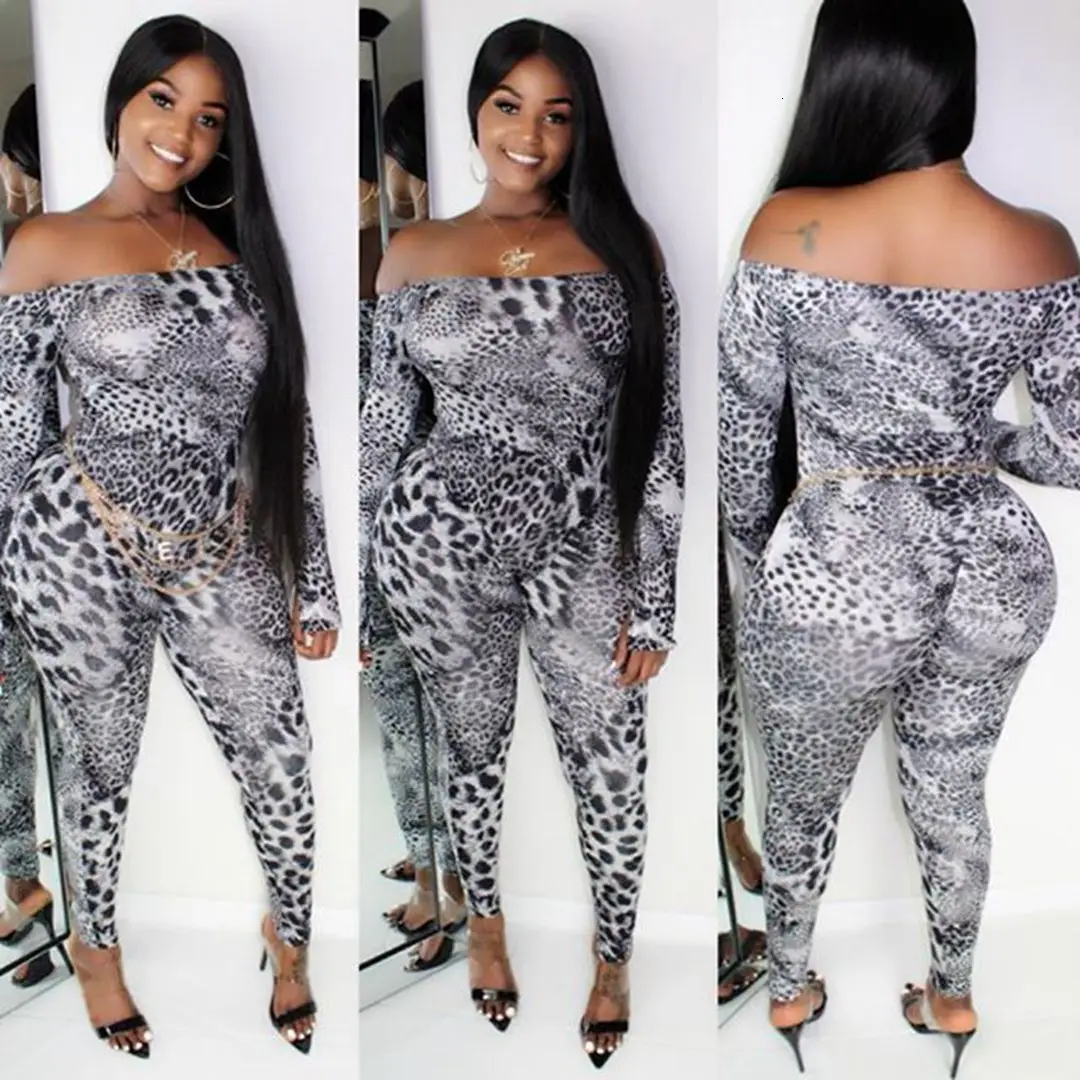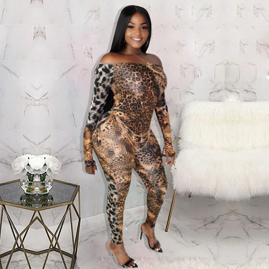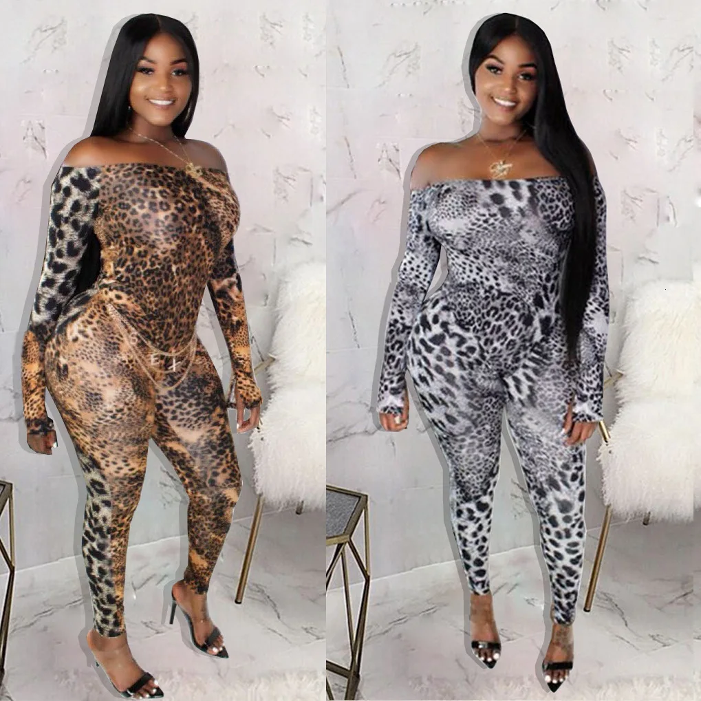 New Leopard Print Bodycon Sexy Jumpsuit Women Off Shoulder Slash Neck Women Romper Club Night Overalls Long Sleeve Party Jumpsuit