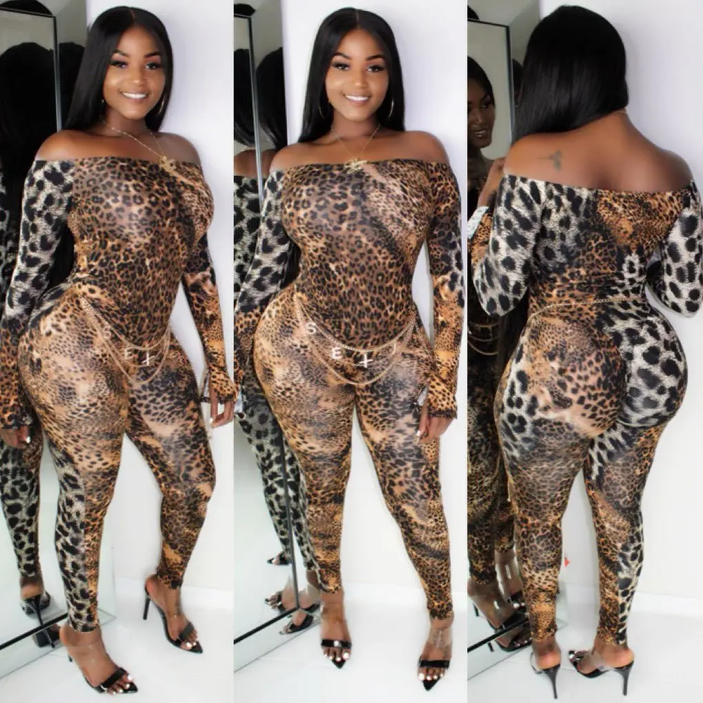 Images of Leopard Print Bodycon Sexy Jumpsuit Women Off Shoulder Slash Neck Women Romper Club Night Overalls Long Sleeve Party Jumpsuit :