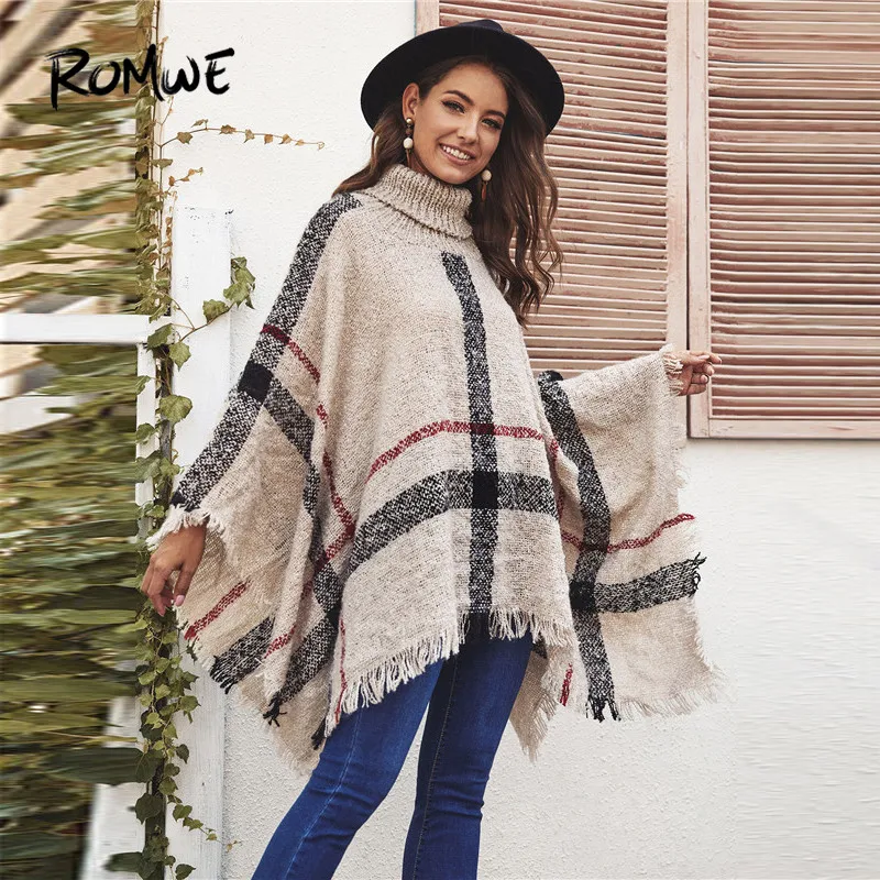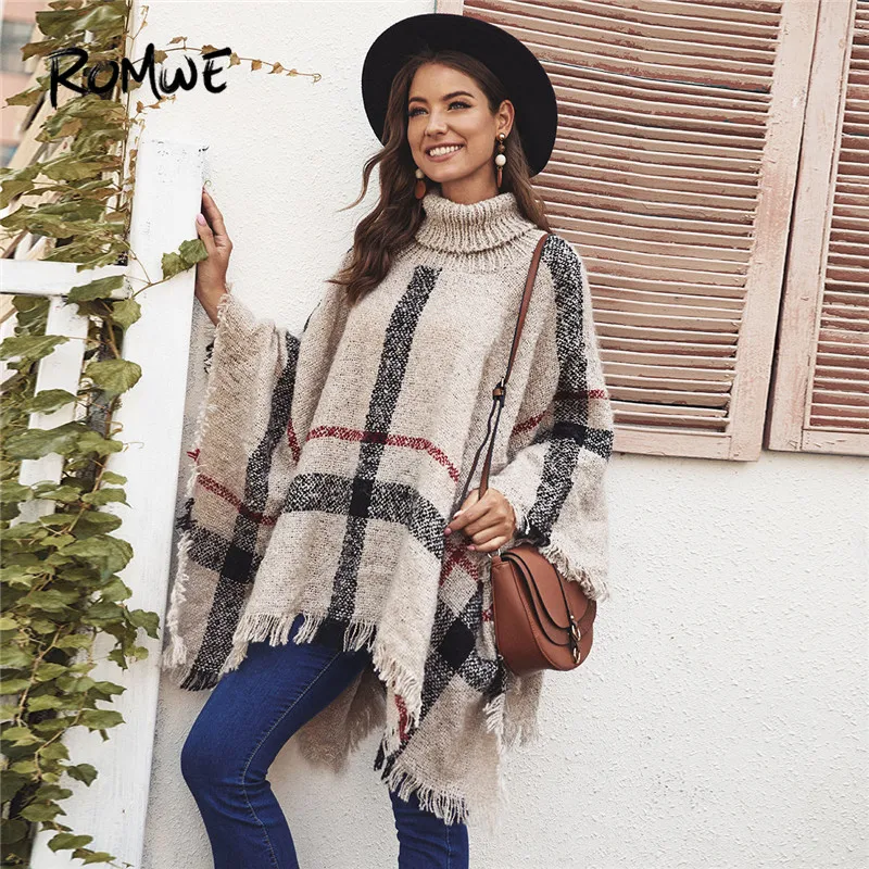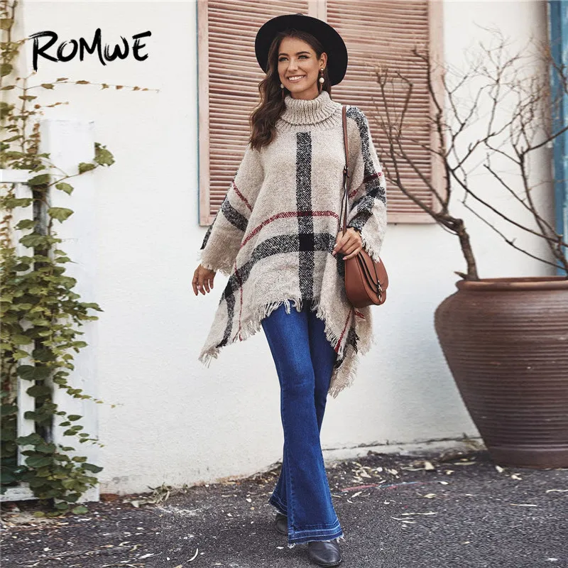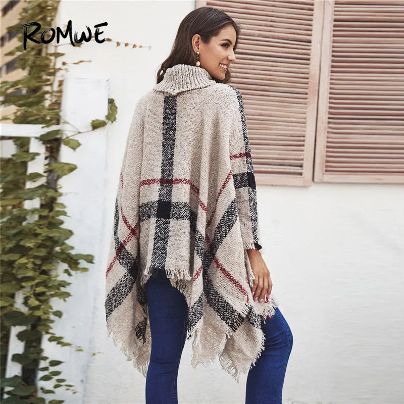 New ROMWE Fringe Hem Plaid Women Sweater Cape Casual Turtleneck Oversized Sweater Fall Winter Khaki Long Sweaters Ladies Pullovers