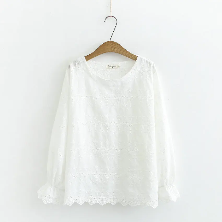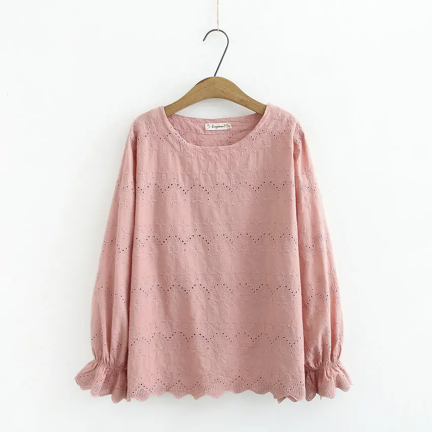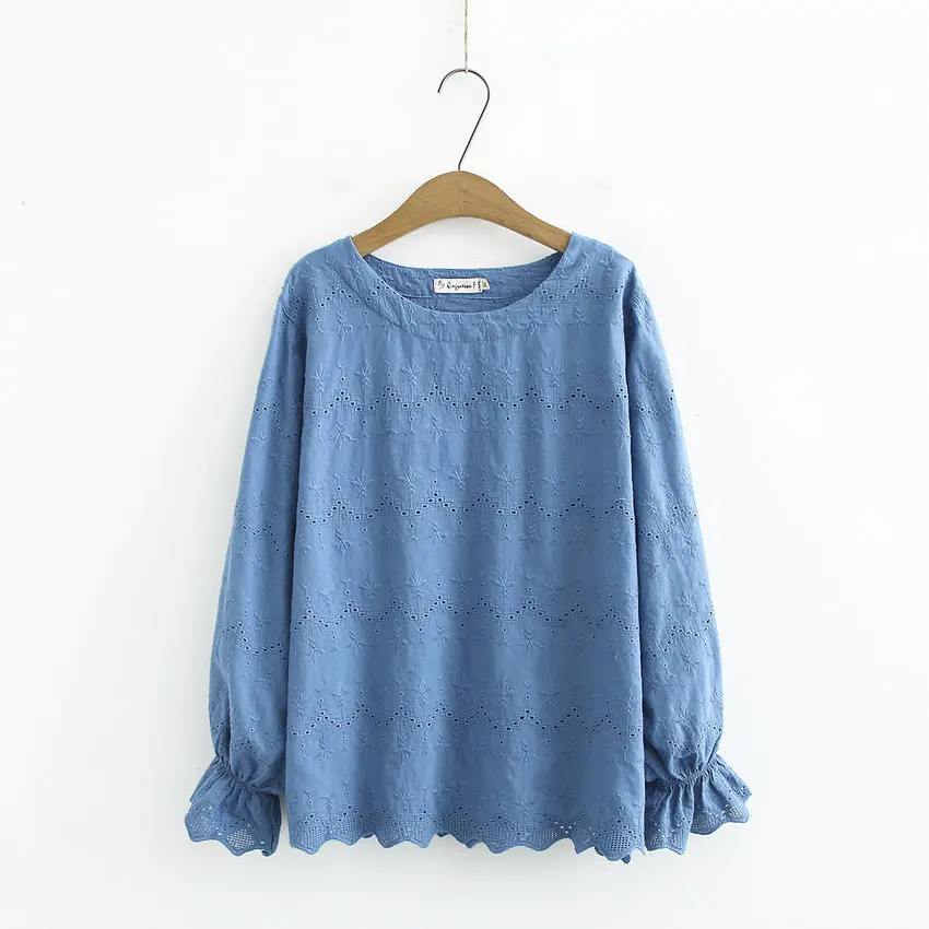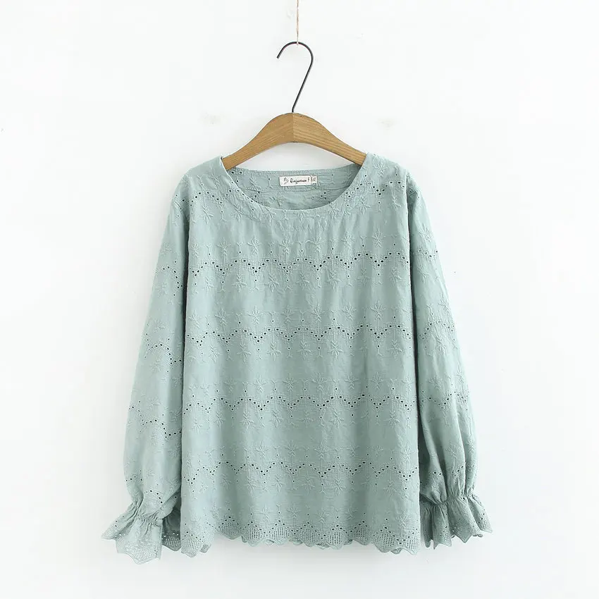 Best Offer Spring Women Crochet Blouses Blue Pink White Green Plain Colour Round Collar Ruffle Cuff Design Cotton Top Female New Arrival