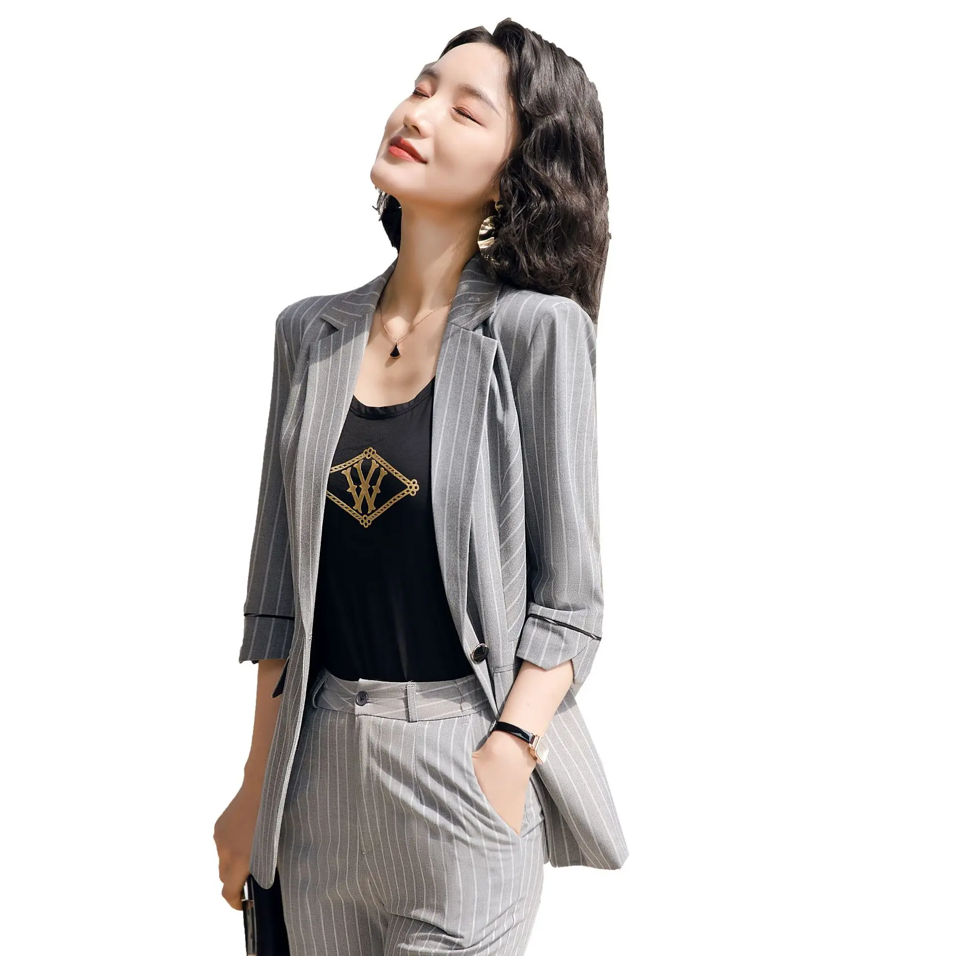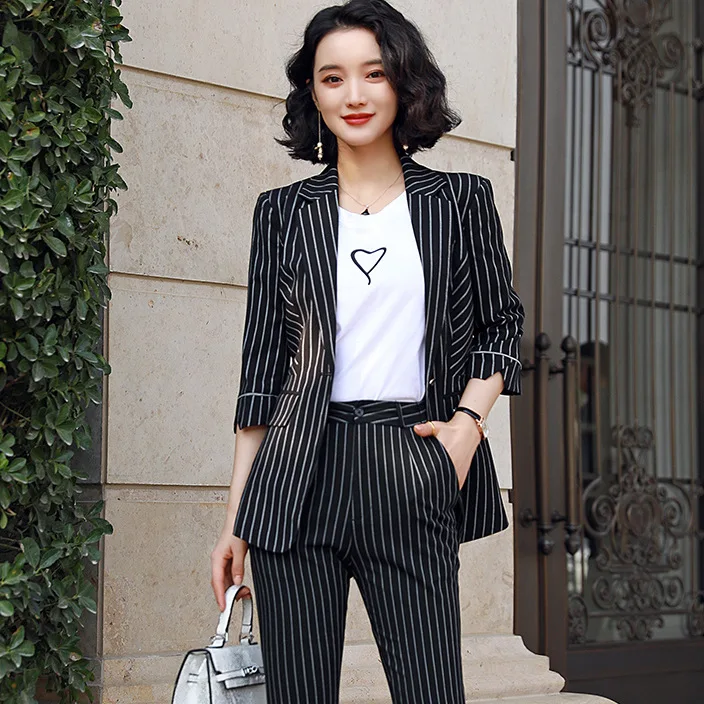 Best Offer 2020 Black Gray Female Elegant Stripes Women's Suit Set Blazer and Trouser Pant Business Uniform Clothing Office Lady Two Pieces